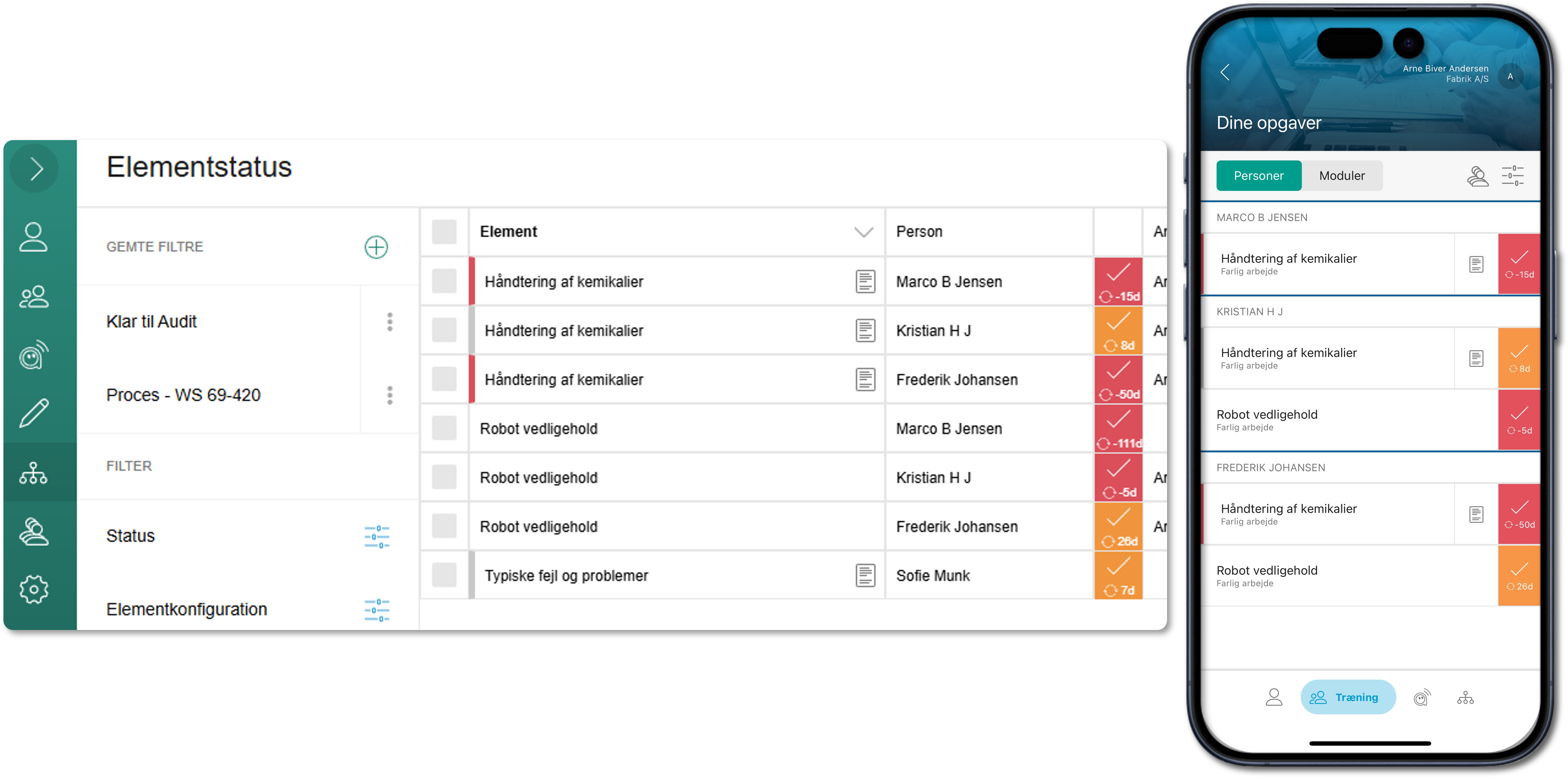 For træner og medarbejder er der adgang til træningsplaner og træningsopgaver. De kan være understøttet af træningsmateriale og adgang til relevante instruktioner. Når træningsopgaver gennemføres for en medarbejder, gemmer platformen automatisk, hvem der har afviklet træning, med hvilken version af træningsmateriale og hvornår. Samtidig opdateres status i lederens kompetencematrix.